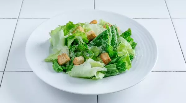 עלי חסה רומאית ברוטב שום, אנשובי, לימון ושמן זית כתית, מעוטרים בגבינת פרמז’אנו וקרוטונים. תוספת עוף – 25 ש״ח