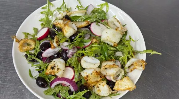 מוגש על עלי אורוגולה, בצל סגול, זיתי קלמטה וצנונית