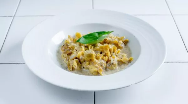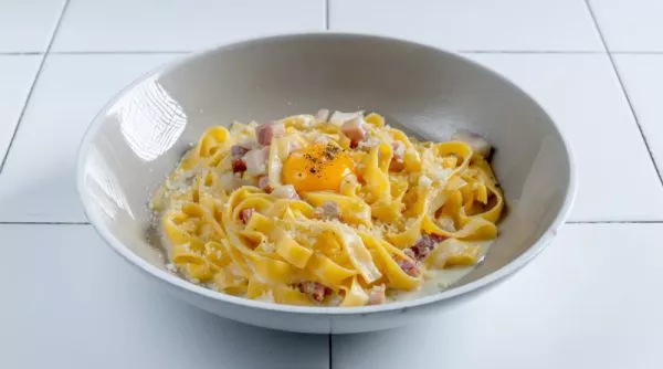 ​פטוצ’יני עם בייקון, שמנת, שום, יין לבן, אגוז מוסקט, פרמז’אנו וחלמון ביצה