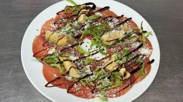 קרפציו בתיבול שמן זית, בלסמי מצומצם, ארטישוק, פרמזן ואורוגולה