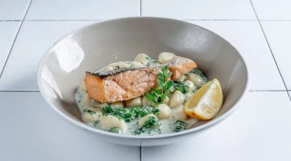 צרוב על הגריל בתוספת ניוקי תפוחי אדמה ברוטב חמאה, יין לבן, שמנת ועשבי תיבול