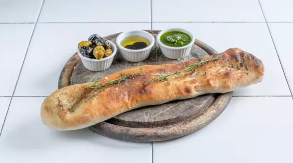 לחם בסגנון דרום איטליה המוגש לצד שמן זית, חומץ בלסמי וזיתים תוצרת הבית
