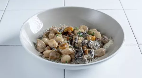 ניוקי מוקפץ בחמאה, פטריות, ערמונים, מחית כמהין שחורה, שום ויין לבן