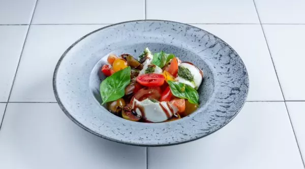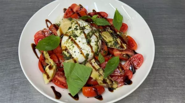 עגבניות טריות ועגבניות שרי, גבינת מוצרלה (18% שומן) ועלי בזיליקום טריים בזילוף שמן זית כתית מעולה, ובלסמי מצומצם