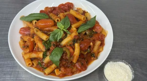 פסטה מסוג פנה מוקפצת במחבת עם רוטב פומודורו, שום, צ׳ילי, עלי בזיליקום ופרמז׳ן
