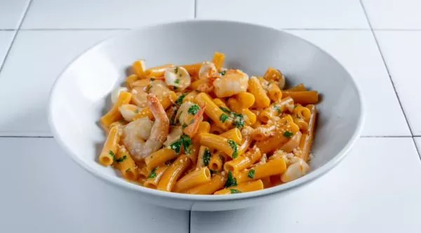 פסטה מסוג פנה מוקפצת במחבת עם שרימפס, קלמארי, שום, שמנת, ממרח עגבניות מיובשות ויין לבן