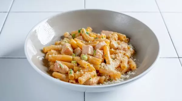 ‫פסטה מסוג פנה מוקפצת במחבת עם נתחי סלמון מפורקים, חמאה, בצל ירוק, שמנת, גבינת פרמז’אנו