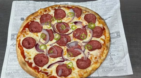רוטב עגבניות טריות מאיטליה, נקניק פפרוני, בצל סגול, צ’ילי טרי וגבינת מוצרלה