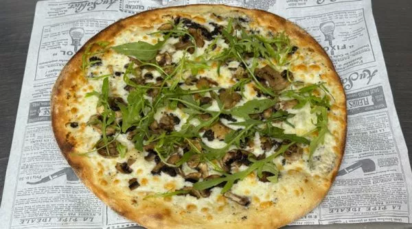 פיצה לבנה, מסקרפונה כמהין לבנות, פטריות, גבינת מוצרלה, עלי ארוגולה וצ’ילי טרי