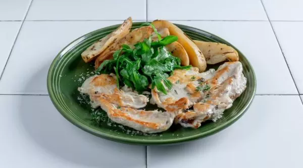 חזה עוף טרי במרינדה של שמן זית, שום ועשבי תיבול צרובים על הגריל בתוספת פלחי תפוחי אדמה אפויים עם שום ועשבי תיבול