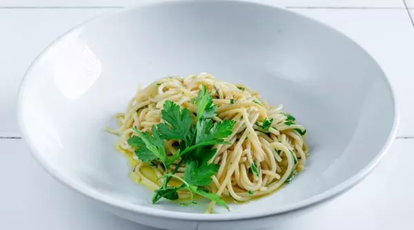 פסטה מסוג ספגטי מוקפצת בשמן זית עם זוקיני, תרד, טימין, שום, פטרוזיליה וציר ירקות